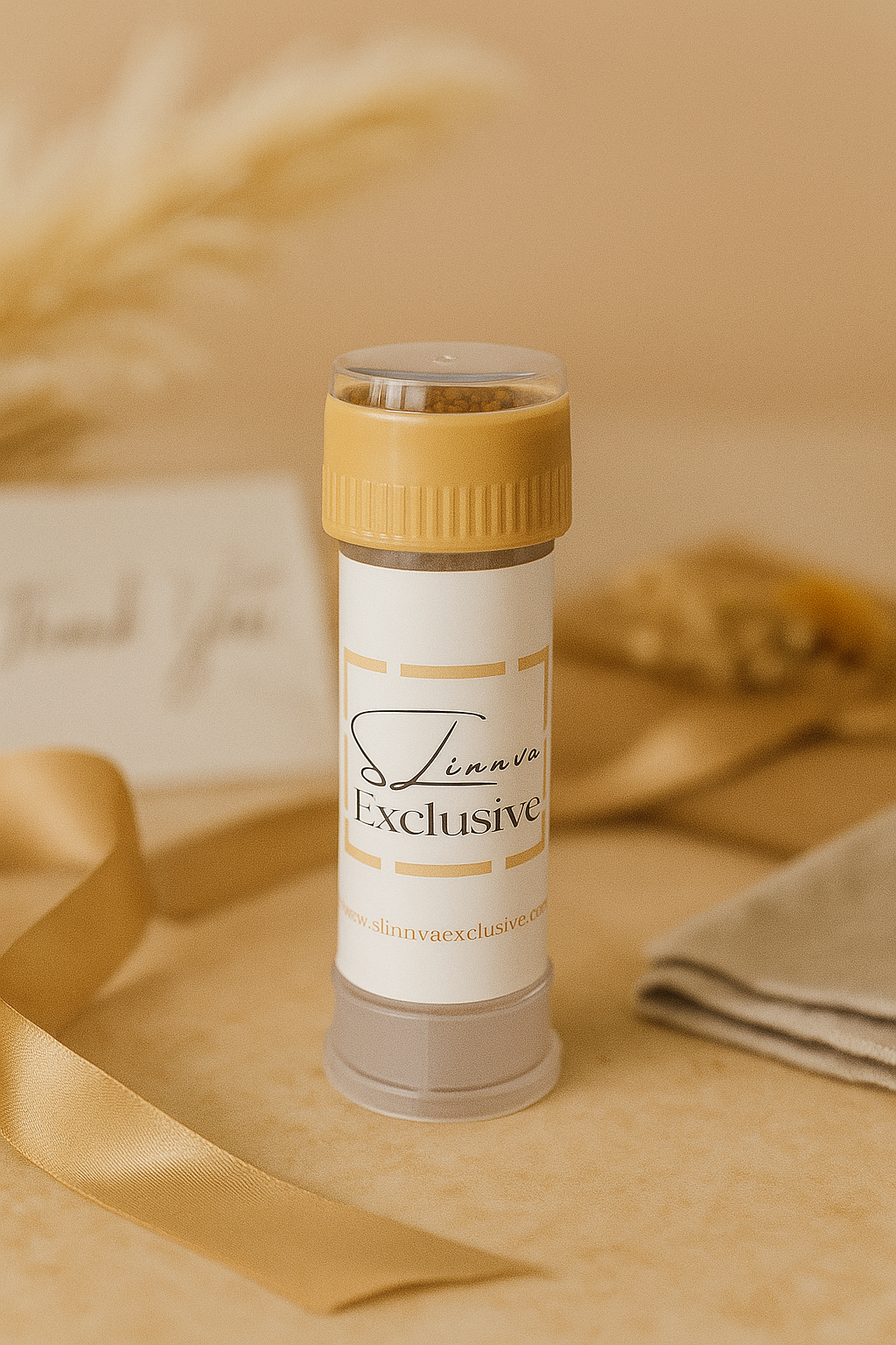 The Personalized Bubble Blower Set includes four refillable clear tubes finished with gold tone caps and adorned with hand applied custom labels. Each label is created in a soft neutral palette of white beige and gold, designed to blend seamlessly with a wide range of event themes. The tubes are lightweight, refined and ready to gift upon arrival, with each label carefully applied to ensure a clean polished finish. Every piece is crafted with the same attention to detail that defines Slinnva Exclusive, making the set both elegant and memorable.