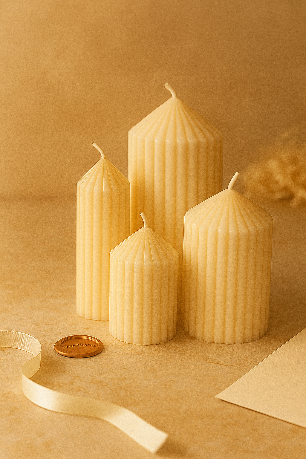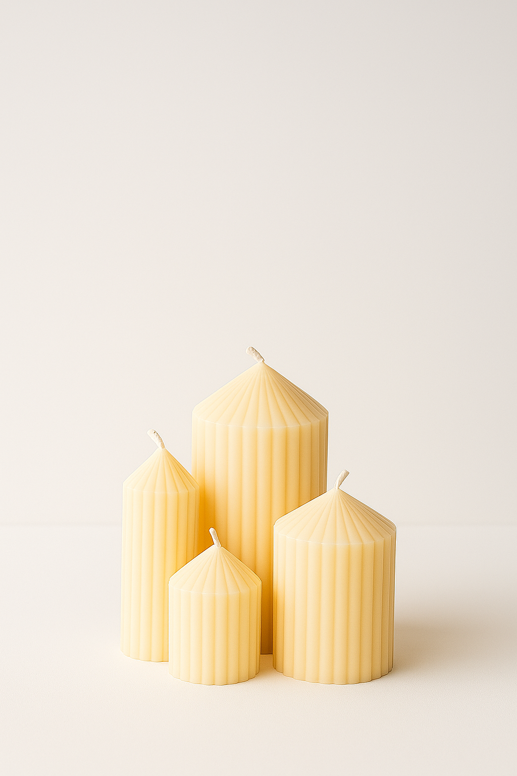 Calm shapes and soft minimalism come together in the Sculpted Serenity Quad. This off white candle set features four sculptural pillars with a smooth ribbed texture, each one hand poured with a premium soy and coconut wax blend to bring a warm serene presence into your home. Their architectural silhouettes add quiet elegance to any interior while keeping your styling effortless and modern. The soft neutral tone blends beautifully with warm minimal spaces and creates a gentle visual balance wherever the set is placed.